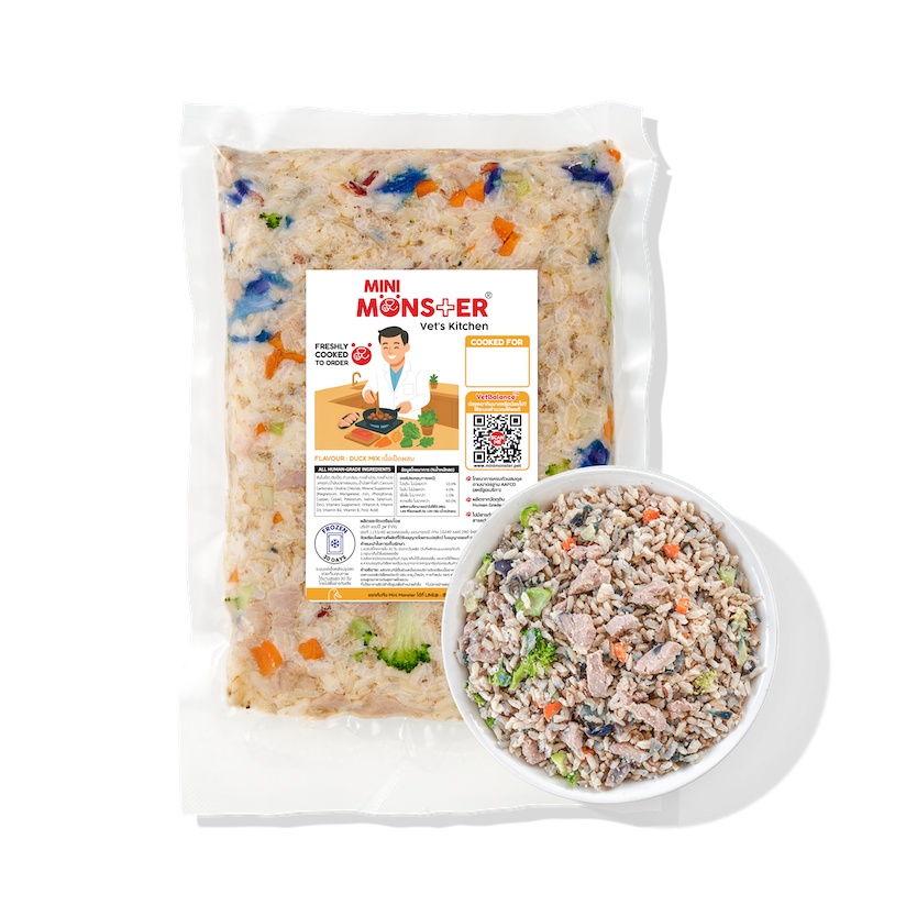 ส่วนผสม : สันในเป็ด, ตับเป็ด, ข้าวกล้อง, กะหล่ำม่วง, กะหล่ำม่วง, แครอท, น้ำมันปลาแซลมอน, น้ำมันคาโนล่า, แคลเซียมคาร์บอเนต, VitaminPremix, MineralPremix, Choline Chloride 60%
