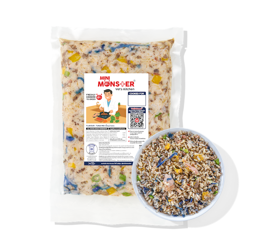 ส่วนผสม : อกไก่, ตับไก่, ข้าวกล้อง, มันหวาน, พริกหวานแดง, บร็อกโคลี, น้ำมันปลาแซลมอน, น้ำมันคาโนล่า, น้ำมันดอกคำฝอย, แคลเซียมคาร์บอเนต, VitaminPremix, MineralPremix, Choline Chloride 60%