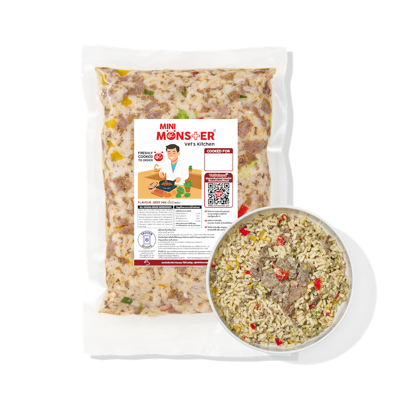 ส่วนผสม : เนื้อวัว, ตับวัว, ข้าวกล้อง, พริกหวานแดง, บร็อกโคลี, ฟักทอง, น้ำมันปลาแซลมอน, น้ำมันคาโนล่า, น้ำมันดอกคำฝอย, แคลเซียมคาร์บอเนต, VitaminPremix, MineralPremix, Choline Chloride 60%