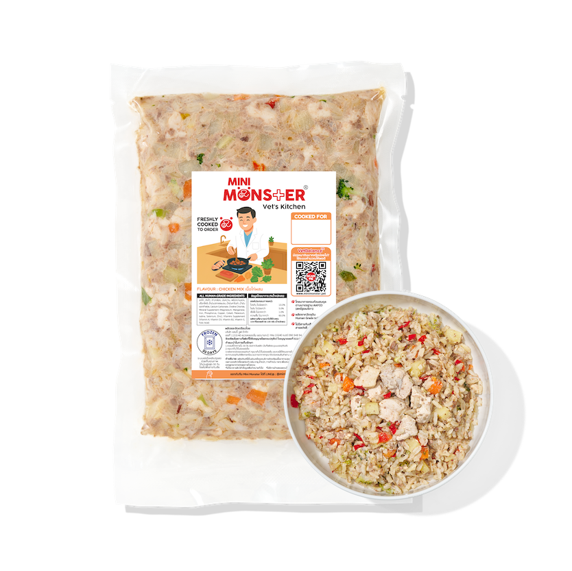 ส่วนผสม : อกไก่, ตับไก่, ข้าวกล้อง, มันหวาน, พริกหวานแดง, บร็อกโคลี, น้ำมันปลาแซลมอน, น้ำมันคาโนล่า, น้ำมันดอกคำฝอย, แคลเซียมคาร์บอเนต, VitaminPremix, MineralPremix, Choline Chloride 60%