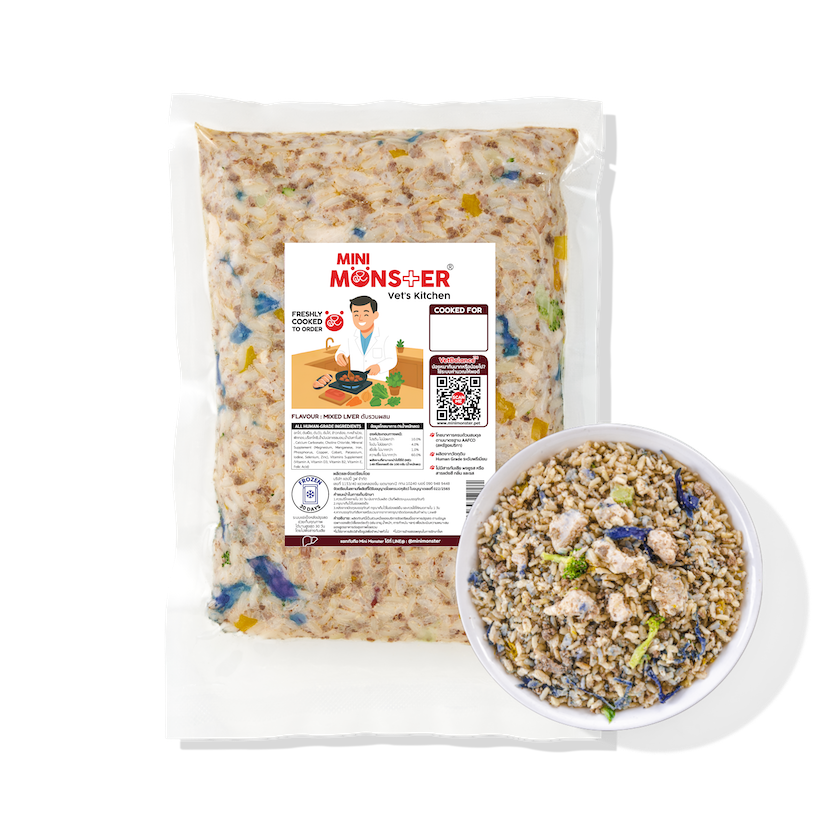 ส่วนผสม : อกไก่, ตับเป็ด, ตับวัว, ตับไก่, ข้าวกล้อง, กะหล่ำม่วง, ฟักทอง, บร็อกโคลี, น้ำมันปลาแซลมอน, น้ำมันคาโนล่า, แคลเซียมคาร์บอเนต, VitaminPremix, MineralPremix, Choline Chloride 60%