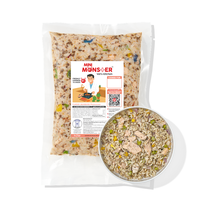 ส่วนผสม : เนื้อปลาแซลมอน, ตับวัว, ข้าวกล้อง, กะหล่ำปลีม่วง, ถั่วฝักยาว, ฟักทอง, น้ำมันปลาแซลมอน, น้ำมันคาโนล่า, น้ำมันดอกคำฝอย, แคลเซียมคาร์บอเนต, VitaminPremix, MineralPremix, Choline Chloride 60%